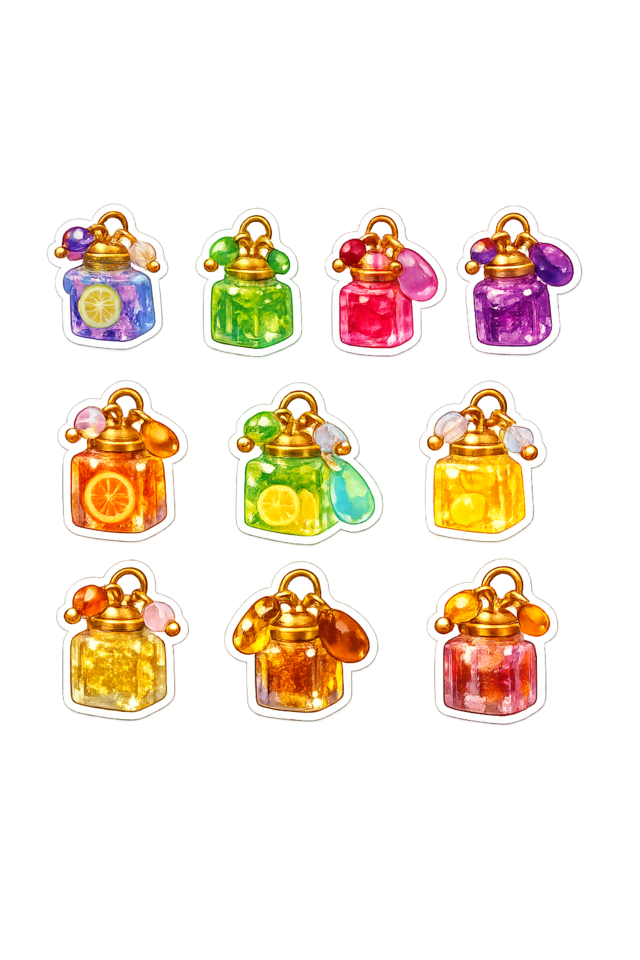 1枚目をシールにしています 小瓶1つの大きさは2センチほどです(人差し指くらい) 一袋20枚入りです(10種類×2セット) 種類が3つあるので選択してください ・透明(写真3枚目) ・ツヤツヤ(白色背景、写真4枚目) ・MIX(透明とツヤツヤが10枚ずつ) シール帳や手帳、スマホの裏側など 自分の好きなところに貼って使ってください✨